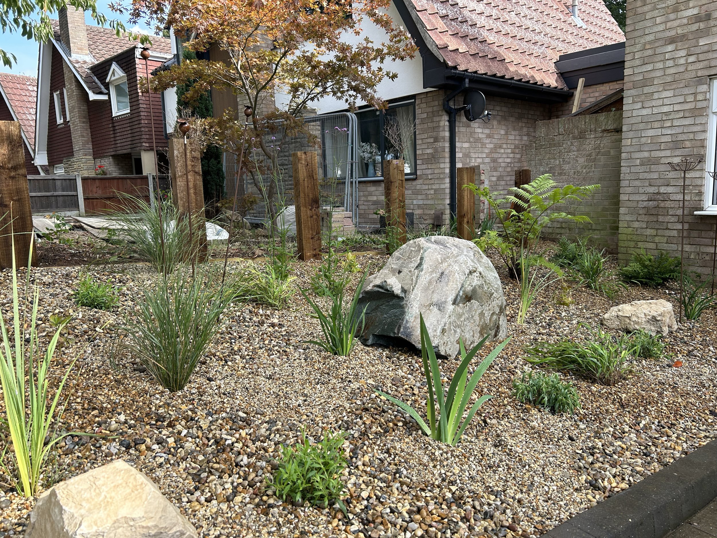 A contemporary shingle dry garden that perfectly compliments this properties front aspect.